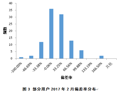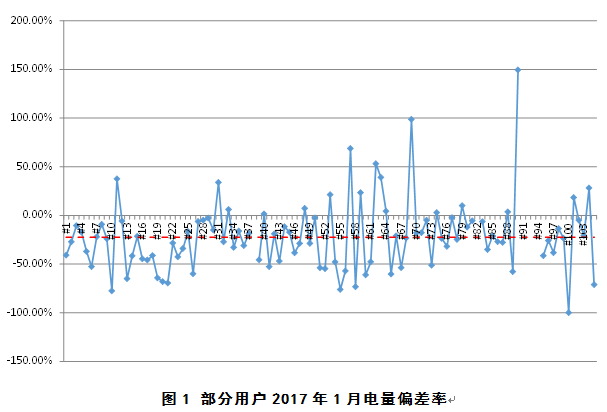 圖1為2017年1月電量偏差率,由于1月尚未開始月度競(jìng)價(jià),是根據(jù)1月實(shí)際用電量與2016年12月所簽訂年度長協(xié)合同中的1月分解電量的偏差來計(jì)算的。