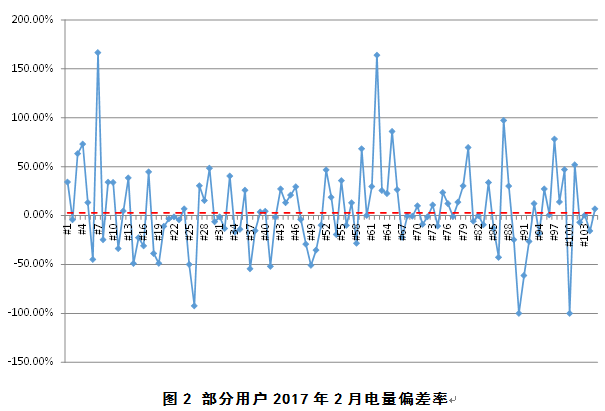 圖2為即為按《基本規(guī)則》計(jì)算的2月電量偏差率。1月偏差率最大為149.44%,最小為-100.00%(由于某種原因用電量為0),平均偏差為-22.46%(考慮正負(fù)值相抵消,如圖中紅色虛線所示),屬于系統(tǒng)性負(fù)偏差。2月偏差率最大為166.50%,最小為-100.00%(由于某種原因用電量為0),平均偏差為2.72%(考慮正負(fù)偏差電量相抵消,如圖中紅色虛線所示),僅略高于2%的允許正偏差。