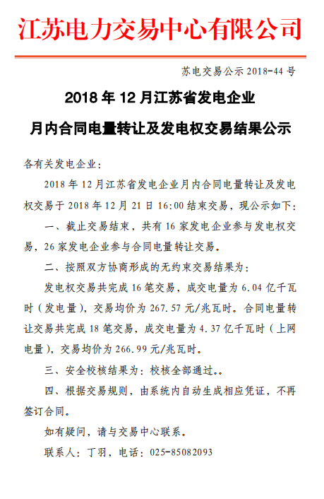 江蘇電力交易中心日前發(fā)布了《2018年12月江蘇省發(fā)電企業(yè)月內(nèi)合同電量轉(zhuǎn)讓及發(fā)電權(quán)交易結(jié)果公示》