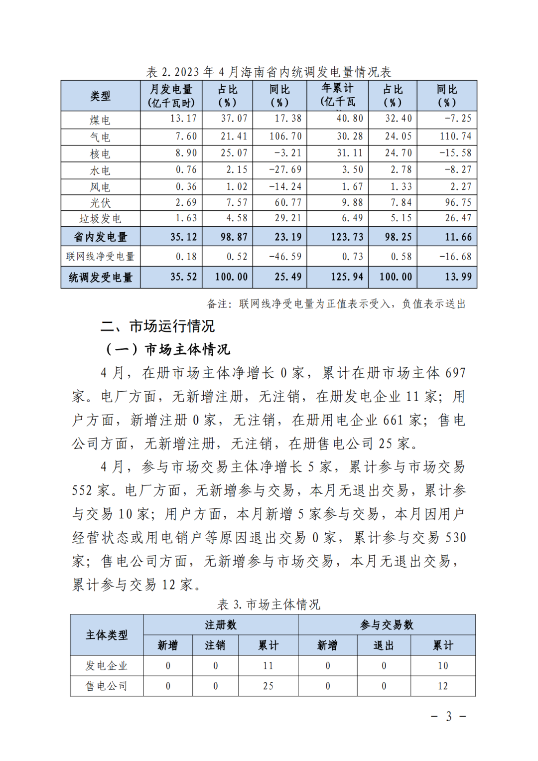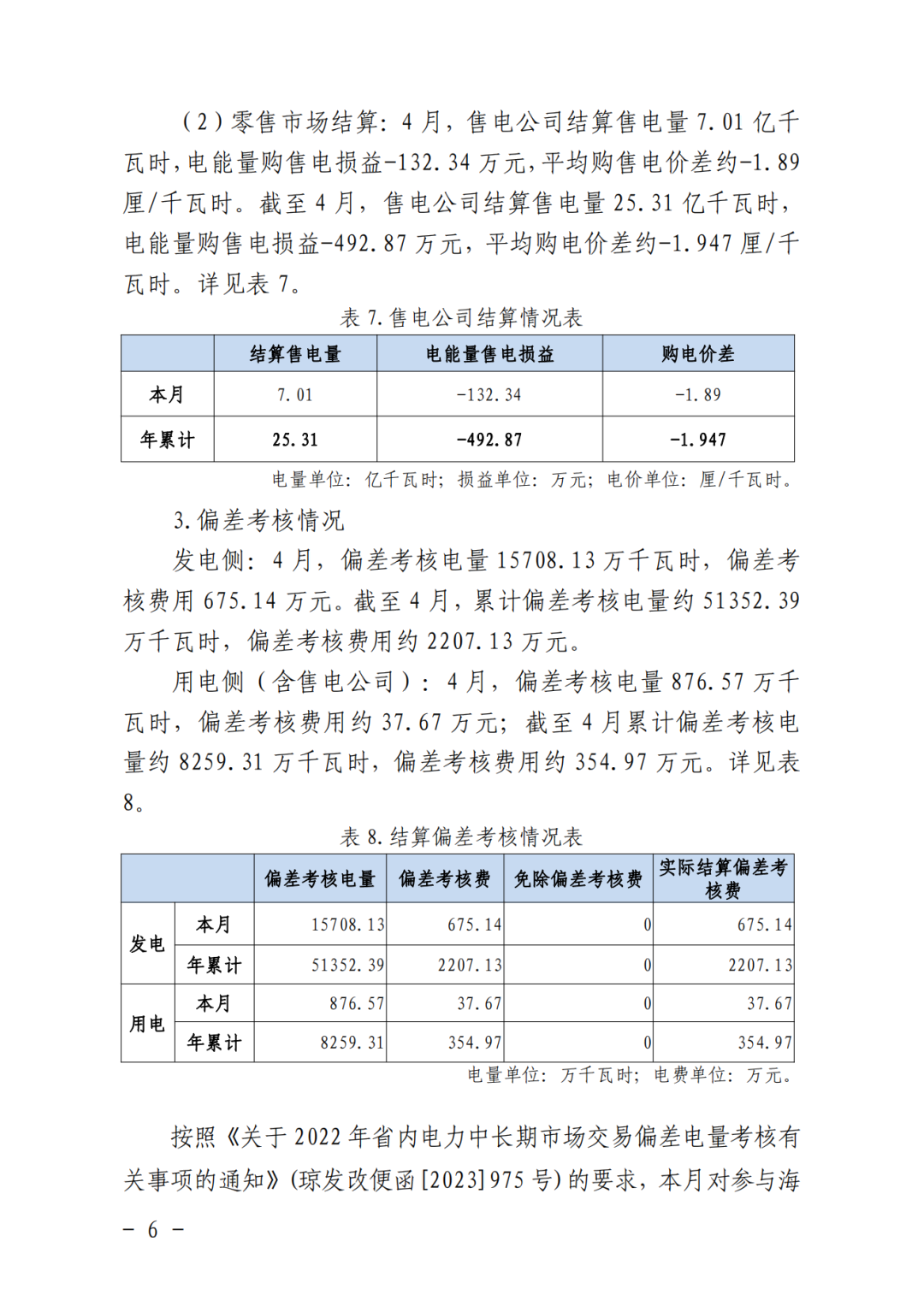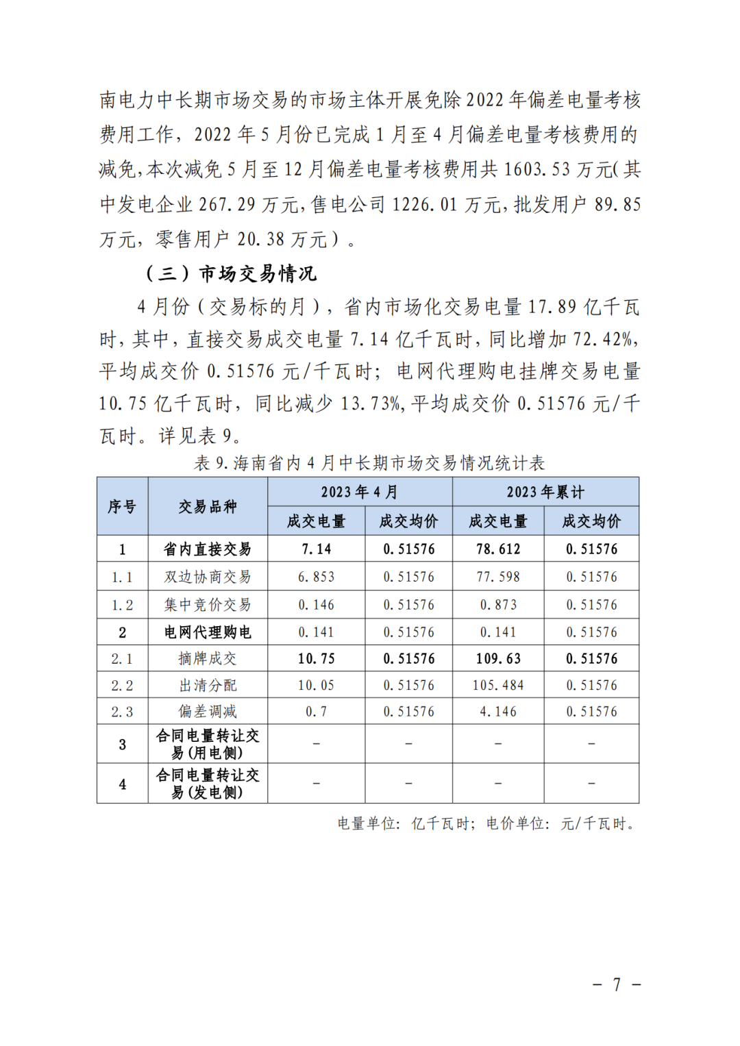 海南電力交易中心2023年4月電力中長期市場運(yùn)行執(zhí)行信息披露