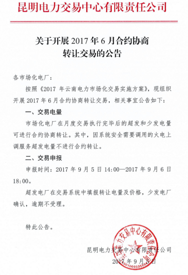 昆明電力交易中心日前發(fā)布了《關于開展2017年6月合約協(xié)商轉(zhuǎn)讓交易的公告》,公告中稱,市場化電廠在月度交易執(zhí)行完畢后的超發(fā)和少發(fā)電量可進行合約協(xié)商轉(zhuǎn)讓。申報時間:9月5日14:00---9月6日18:00。