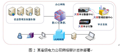 在營銷網(wǎng)的核心業(yè)務(wù)系統(tǒng),需要進(jìn)行數(shù)據(jù)庫維護(hù)等操作的合規(guī)審計(jì),該電力公司選擇了啟明星辰的天玥網(wǎng)絡(luò)安全審計(jì)系統(tǒng),為電網(wǎng)內(nèi)各信息系統(tǒng)提供了一個(gè)用戶管理、應(yīng)用操作監(jiān)控審計(jì)的管理平臺(tái),從而對(duì)關(guān)鍵人員的核心操作進(jìn)行了集中的管理和控制。與此同時(shí),天玥網(wǎng)絡(luò)安全審計(jì)系統(tǒng)支持一個(gè)數(shù)據(jù)中心管理多臺(tái)審計(jì)引擎,同時(shí)支持運(yùn)維、數(shù)據(jù)庫、OA三大種類的網(wǎng)絡(luò)操作行為審計(jì),通過二維統(tǒng)計(jì)、三維統(tǒng)計(jì)、折線趨勢分析、柱狀統(tǒng)計(jì)分析等多種統(tǒng)計(jì)分析手段為該電力公司針對(duì)收集到的網(wǎng)絡(luò)日志提供了分析,總體部署如下圖2所示: