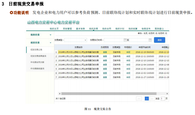 另外印發(fā)了現(xiàn)貨申報(bào)操作手冊(cè):發(fā)電企業(yè)現(xiàn)貨功能包括中長(zhǎng)期合同分解,中長(zhǎng)期曲線查詢、現(xiàn)貨交易公告、現(xiàn)貨交易結(jié)果查詢、日前市場(chǎng)預(yù)計(jì)收益;電力用戶現(xiàn)貨功能包括中長(zhǎng)期合同分解確認(rèn)、現(xiàn)貨交易公告。