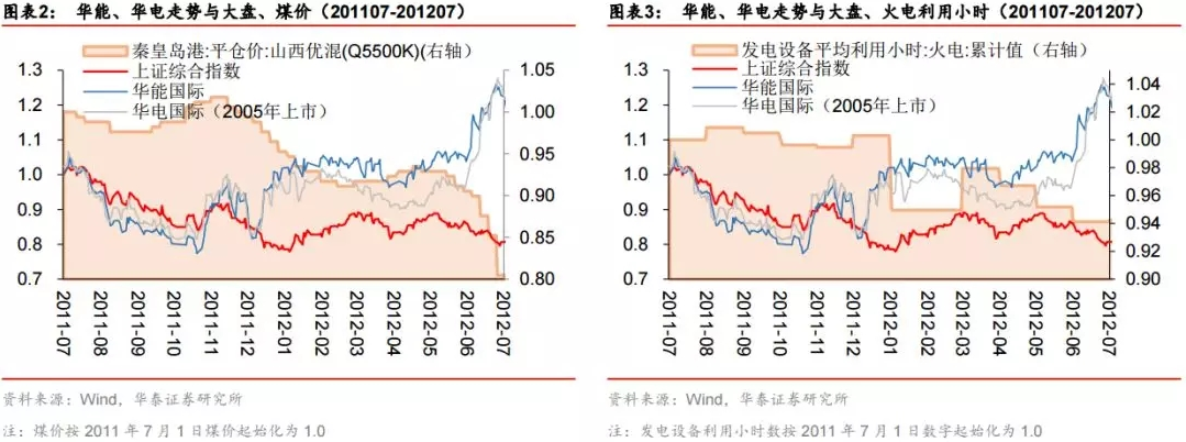 1)2011 年 7 月-2012 年 7 月的防御性體現(xiàn),華電國際上漲 35%,華能國際上漲 36%(同期上證指數(shù)下跌 21%),當(dāng)時煤價下跌 27%, 利用小時數(shù)緩跌 6%;