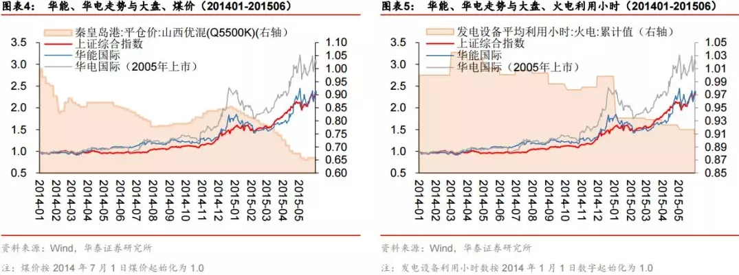 2)2014 年 1 月-2015 年 6 月的進(jìn)攻性,華電國際上漲 251%,華能國際上漲 159%(同期上證指數(shù)上漲 136%),當(dāng)時煤價累 計下跌 34%,利用小時數(shù)緩跌 9%。