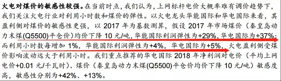與 2011/2014 相似的是,本輪煤價自 2016 年下半年高位運(yùn)行,火電盈利進(jìn)入“寒冬”;煤電聯(lián)動“千呼萬喚始不出來”,基本面和相對估值位于底部。4Q17 火電幾乎全行業(yè)虧損,上市公司業(yè)績對煤價敏感性強(qiáng),龍頭華能國際、華電國際的利潤彈性為 29%/37%(17 年煤價 10 元/噸的波動) vs 對電量的敏感性 4%/5%(17 年利用小時數(shù) 1%的波動);華電國際在 18 年煤價-10 元/噸的假設(shè)下,利潤+13%。我們認(rèn)為,一旦煤價下行趨勢確立,煤價下跌帶給火電業(yè)績的增厚可觀。