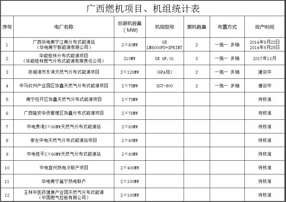 廣西天然氣分布式項(xiàng)目剛剛起步,多半項(xiàng)目在前期準(zhǔn)備中,統(tǒng)一標(biāo)注為待核準(zhǔn)。