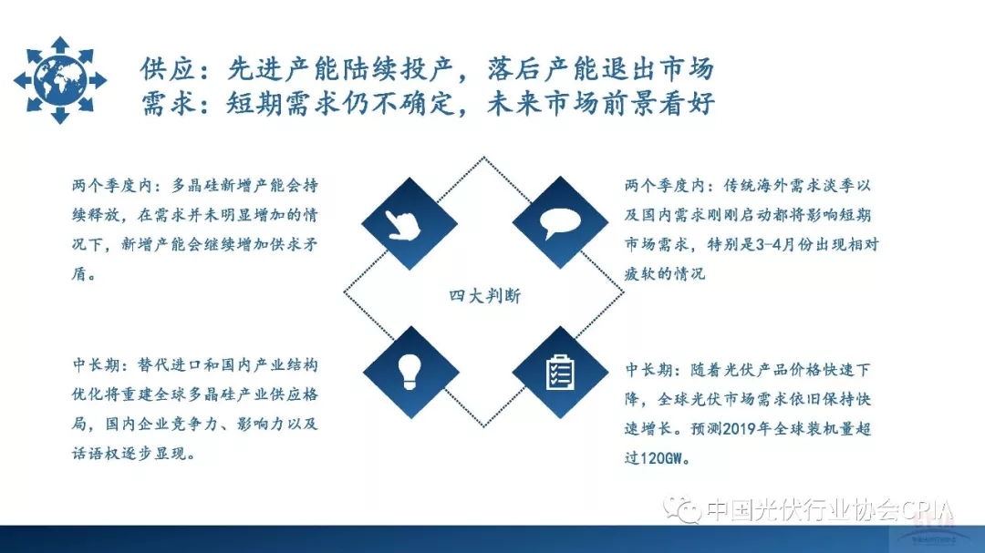 2019年1月17日,在中國光伏行業(yè)協(xié)會主辦的“光伏行業(yè)2018年發(fā)展回顧與2019年形勢展望研討會”上,中國有色金屬工業(yè)協(xié)會硅業(yè)分會副秘書長馬海天作2018年多晶硅市場現(xiàn)狀與發(fā)展趨勢報告。馬海天在報告中提到,受需求和新政影響,2018年全年多晶硅價格一路下跌,因此月度產(chǎn)量和企業(yè)產(chǎn)量分化明顯;受中國光伏終端需求縮減影響,多晶硅累計(jì)進(jìn)口量近十年來首年同比下降,但是多晶硅產(chǎn)能擴(kuò)張期仍在繼續(xù)。馬海天重點(diǎn)指出了多晶硅產(chǎn)業(yè)發(fā)展中的產(chǎn)能過剩和產(chǎn)品品質(zhì)問題,并預(yù)測需求和供應(yīng)不利情況在2019年上半年可能會共振出現(xiàn),下半年逐步好轉(zhuǎn),同時市場供應(yīng)可能會出現(xiàn)大幅波動,海外企業(yè)將退出。根據(jù)馬海天的總結(jié),我國的多晶硅和光伏在快速發(fā)展過程中面臨著不少貿(mào)易糾紛,但是我國目前的多晶硅和光伏產(chǎn)業(yè)處于領(lǐng)先地位,未來前景光明。