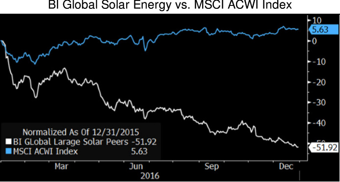 據(jù)彭博行業(yè)研究平臺消息,2016年,全球大型太陽能行業(yè)集團(tuán)股價下跌幅度達(dá)52%,表現(xiàn)不佳,同期MSCIACWI指數(shù)上漲幅度為5.6%。美國光伏巨頭SunEdison在去年4月份提交破產(chǎn)保護(hù)申請,加重了行業(yè)內(nèi)的消極情緒,與此同時,美國住宅用太陽能設(shè)備發(fā)展速度緩慢,2017年相關(guān)項目數(shù)量降低。除此之外,中美貿(mào)易持續(xù)的緊張局勢、中國2020年增長目標(biāo)放緩以及去年下半年開始的國內(nèi)太陽能設(shè)備需求放緩給那些面向中國市場的設(shè)備生產(chǎn)商帶來壓力,這些趨勢可能會持續(xù)到2017年。