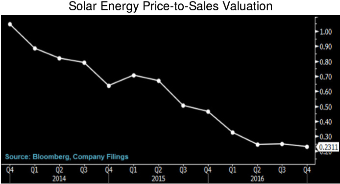 據(jù)彭博行業(yè)研究平臺數(shù)據(jù)顯示,自2015年第四季度以來,全球太陽能行業(yè)集團(tuán)的股價與銷售額比率中位數(shù)從0.5X下降到0.2x,其中主要原因仍然是由于股價下跌52%。2016年6月底,來自中國的太陽能設(shè)備需求下降,這些太陽能集團(tuán)收入也開始急劇下滑,這有助于緩解太陽能設(shè)備供過于求的現(xiàn)象。預(yù)期2017年全球太陽能需求放緩,產(chǎn)能增加,會加劇業(yè)內(nèi)對太陽能設(shè)備價格以及生產(chǎn)者利潤空間走低的擔(dān)憂情緒。