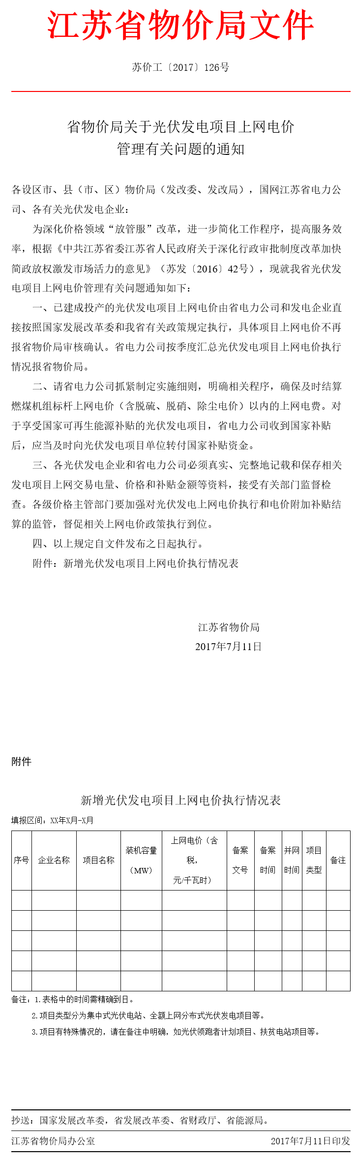 江蘇省物價局關(guān)于光伏發(fā)電項目上網(wǎng)電價管理有關(guān)問題的通知