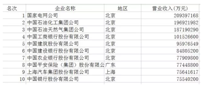2017中國(guó)企業(yè)500強(qiáng)的營(yíng)業(yè)收入總額首次突破60萬(wàn)億元,達(dá)到了64.00萬(wàn)億元,相當(dāng)于去年我國(guó)GDP總額的86%。榜單上,營(yíng)業(yè)收入超過1000億元的共有157家,較上年增加5家,繼續(xù)擴(kuò)容。其中,國(guó)家電網(wǎng)公司成為中國(guó)唯一營(yíng)業(yè)收入超過2萬(wàn)億元的企業(yè),僅次于美國(guó)沃爾瑪,是世界第二大企業(yè)。
