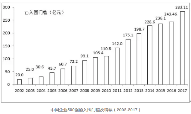 2017中國(guó)企業(yè)500強(qiáng)的入圍門檻為營(yíng)業(yè)收入283.11億元,達(dá)到歷史新高,較上年大幅提高了39.65億元,提高幅度是自2002年發(fā)布中國(guó)企業(yè)500強(qiáng)以來(lái)以來(lái)最大的。