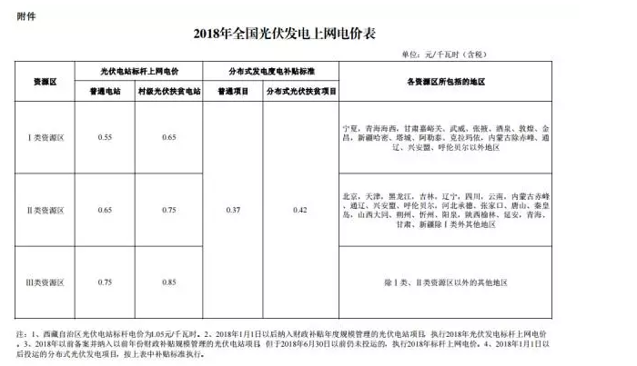 國(guó)家發(fā)展改革委下發(fā)《關(guān)于2018年光伏發(fā)電項(xiàng)目?jī)r(jià)格政策的通知》,要求降低2018年1月1日之后投運(yùn)的光伏電站標(biāo)桿上網(wǎng)電價(jià),Ⅰ類、Ⅱ類、Ⅲ類資源區(qū)標(biāo)桿上網(wǎng)電價(jià)分別調(diào)整為每千瓦時(shí)0.55元、0.65元、0.75元(含稅);村級(jí)光伏扶貧電站上網(wǎng)電價(jià)分別為0.65元、0.75元、0.85元;通知規(guī)定,2018年1月1日以后投運(yùn)的、采用“自發(fā)自用、余量上網(wǎng)”模式的分布式光伏發(fā)電項(xiàng)目,全電量度電補(bǔ)貼標(biāo)準(zhǔn)降低0.05元,即補(bǔ)貼標(biāo)準(zhǔn)調(diào)整為每千瓦時(shí)0.37元(含稅)。采用“全額上網(wǎng)”模式的分布式光伏發(fā)電項(xiàng)目按所在資源區(qū)光伏電站價(jià)格執(zhí)行。