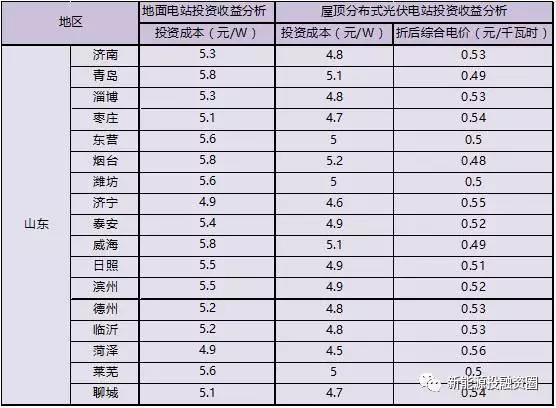 由于山東2017年新增500MW指標(biāo)全部用于光伏扶貧,所以本篇地面光伏按扶貧進(jìn)行測算。根據(jù)上述模型參數(shù)測算地面電站投資成本(元/W),見最后表格。
