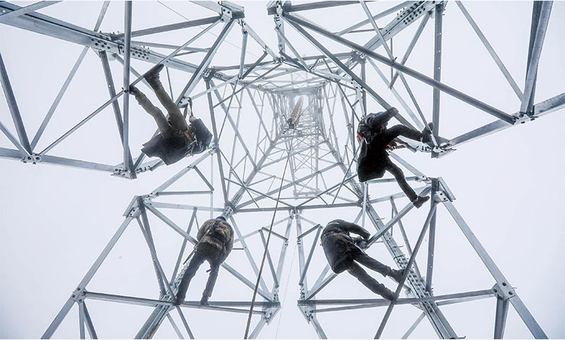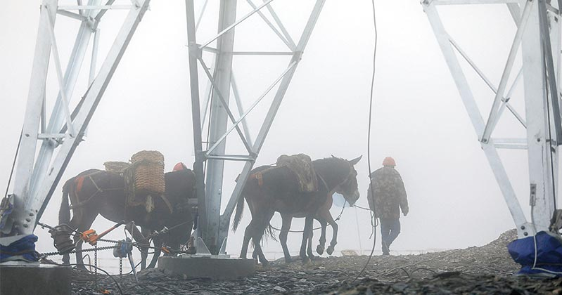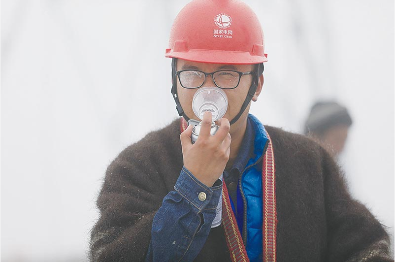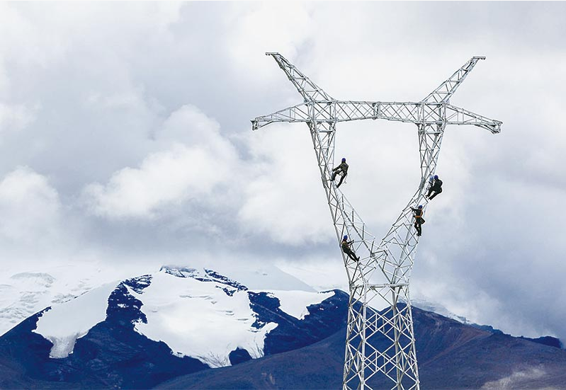 在海拔5548米的西藏山南蒙達拉山頂,施工人員正在安裝世界海拔最高的鐵塔。
