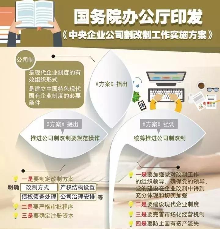2017年6月26日,中央全面深化改革領(lǐng)導(dǎo)小組第三十六次會議審議通過《中央企業(yè)公司制改制工作實施方案》。會議強調(diào),公司制是現(xiàn)代企業(yè)制度的有效組織形式,是建立中國特色現(xiàn)代國有企業(yè)制度的必要條件,今年年底前基本完成國有企業(yè)公司制改制工作。