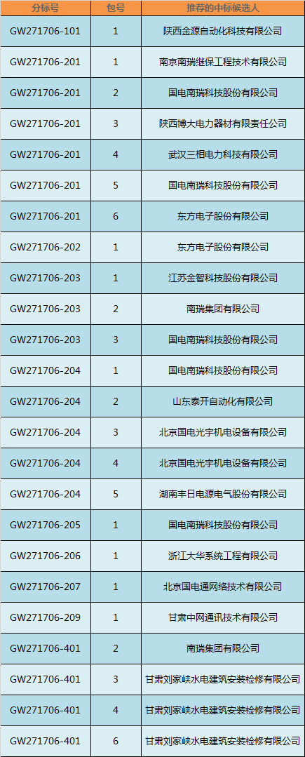 各相關(guān)投標(biāo)人:國網(wǎng)甘肅省電力公司2017年第六次物資招標(biāo)采購項目招標(biāo)評標(biāo)工作已結(jié)束,本次中標(biāo)涉及南瑞集團有限公司、國電南瑞科技股份有限公司等,現(xiàn)將評標(biāo)委員會推薦的中標(biāo)候選人予以公示,公示期3天。投標(biāo)人或