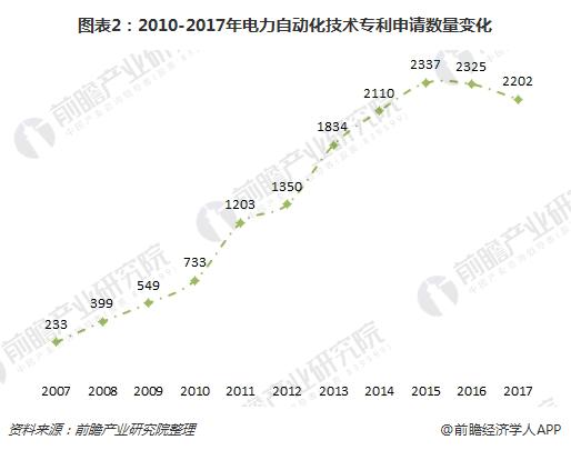 具體來看,在專利申請方面,2010-2017年,我國電力自動化技術(shù)專利申請數(shù)量呈現(xiàn)快速上升的趨勢。2014-2017年,電力自動化技術(shù)專利申請數(shù)量均超過2000項(xiàng)。2017年,電力自動化技術(shù)專利申請數(shù)量為2202項(xiàng)。